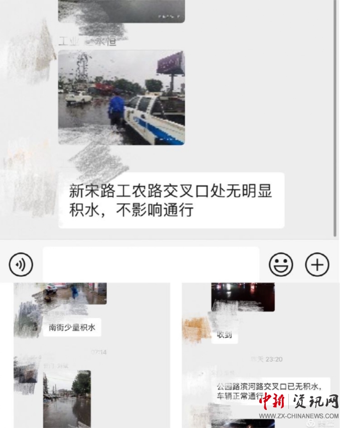 “ 汴京路與工農(nóng)路交叉有積水,積水深度15公分,積水范圍南至化建中學(xué),約1000平方”、“勞動路陽光醫(yī)院十字口,正常通行,南北方向還有積水,最深處約30左右”、“白塔地下道無積水,正常通行”……從清晨直至凌晨,順河區(qū)城管局執(zhí)法大隊(duì)微信工作群不斷更新數(shù)據(jù),各點(diǎn)位巡查人員上傳觀測情況,確保信息暢通。