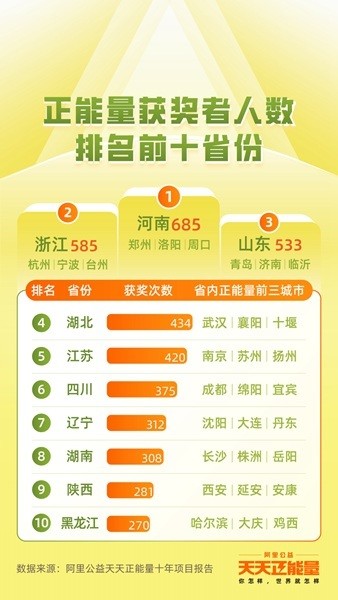 中新河南網(wǎng)1月12日電 (葛高遠(yuǎn) 趙民強(qiáng))一方水土養(yǎng)一方人,在我們身邊,從不缺乏真善美的身影。1月12日,《阿里公益“天天正能量”項(xiàng)目十年評(píng)估報(bào)告》發(fā)布,報(bào)告顯示,十年來(lái)阿里巴巴投入一個(gè)億,弘揚(yáng)凡人善舉,喚醒世道人心,目前已在全國(guó)獎(jiǎng)勵(lì)11570人,其中河南、浙江、山東等省份獲獎(jiǎng)人數(shù)最多。