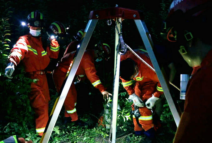 救援人員在井口架設(shè)三腳架,由一名經(jīng)驗(yàn)豐富的消防員攜帶安全吊帶、頭盔等裝備,采用“倒掛金鉤”的方式索降至井底被困者位置。