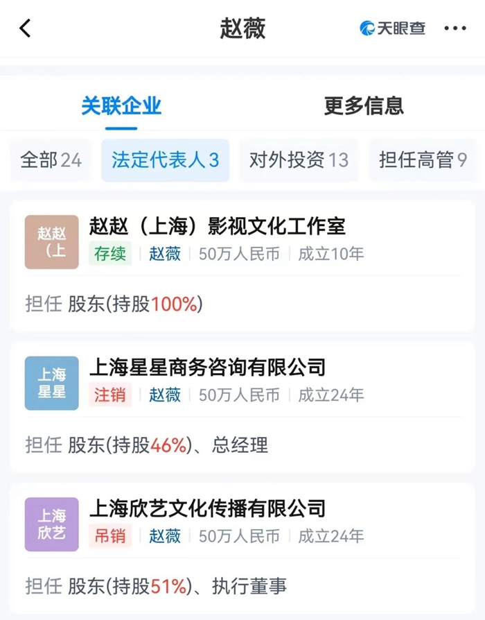 而由趙薇擔(dān)任公司法人的三家公司中,目前僅趙趙(上海)影視文化工作室仍處于存續(xù)期,其余兩家也已被注銷或吊銷。