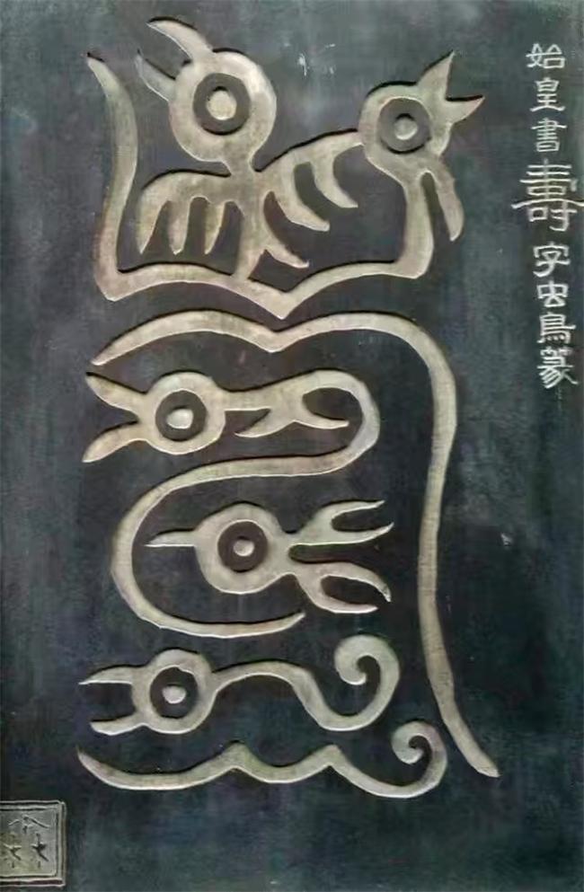 趙力志同志在深入學習和研究古代鳥蟲篆理論的同時,他又投入大量時間去了解古代鳥蟲篆的文獻、實物和歷史背景,他曾到湖南衡山考察《禹王碑》,到成都青羊?qū)m考察始皇書《壽》字,從中理解鳥蟲篆的文化內(nèi)涵和藝術(shù)特色。通過臨摹古代鳥蟲篆經(jīng)典作品,如李斯書寫的秦傳國玉璽上《受命于天既壽永昌》,千字文中《治夲於農(nóng)務(wù)茲稼檣》等文字,他掌握了秦代鳥蟲篆的基本技法和風格特點,為他在鳥蟲篆的創(chuàng)新打下了堅實的基礎(chǔ)。