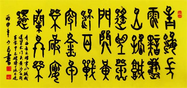 趙力志同志將現(xiàn)代審美觀念和技法融入鳥蟲篆書法中,使其更加符合現(xiàn)代人的審美需求。他打破了傳統(tǒng)鳥蟲篆的某些固定模式,如簡化部分復(fù)雜的筆畫結(jié)構(gòu),使其更加簡潔明快;同時,他又借鑒了其他書體的優(yōu)點,如行書的流暢性和楷書的規(guī)范性,把鳥蟲篆以前只用于旗幡、兵器、熔器、印章的局限性,創(chuàng)新上升為鳥蟲篆書法,打破傳統(tǒng)的刀刻,變?yōu)槊P書寫,上升為書法作品,使鳥蟲篆書法在保持傳統(tǒng)特色的基礎(chǔ)上更加易于書寫和欣賞。