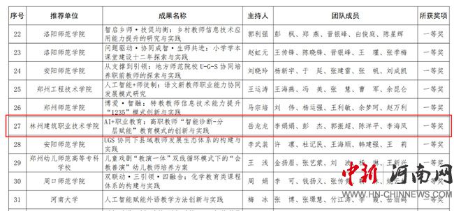 中新河南網(wǎng)9月23日電 近日,河南省教育廳下發(fā)了《關于公布2025年河南省教師教育教學成果獎獲獎項目的通知》(教師〔2025〕176號),林州建筑職業(yè)技術(shù)學院智能建造學院岳龍龍團隊申報的《AI+職業(yè)教育:高職教師“智能診斷-分層賦能”教育模式的創(chuàng)新與實踐》成果,憑借突破性的教學改革理念與顯著的實踐成效榮獲一等獎,這一成果彰顯了林州建院在推動教師教育教學改革、深化人工智能與教育融合方面的顯著成效。
