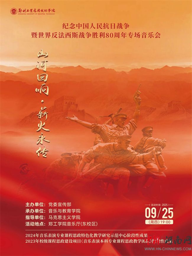 中新河南網(wǎng)9月25日電 2025年是中國(guó)人民抗日戰(zhàn)爭(zhēng)暨世界反法西斯戰(zhàn)爭(zhēng)勝利80周年。這場(chǎng)偉大戰(zhàn)爭(zhēng)是中華民族歷史上的一座重要里程碑,中國(guó)人民以巨大的民族犧牲和精神力量,為世界反法西斯戰(zhàn)爭(zhēng)的勝利作出了不可磨滅的貢獻(xiàn)。為銘記這段烽火歲月,弘揚(yáng)偉大的抗戰(zhàn)精神,鄭州工業(yè)應(yīng)用技術(shù)學(xué)院將于9月25日19:00在東校區(qū)音樂(lè)廳舉辦 “山河回響・薪火永傳” ——紀(jì)念中國(guó)人民抗日戰(zhàn)爭(zhēng)暨世界反法西斯戰(zhàn)爭(zhēng)勝利80周年專場(chǎng)音樂(lè)會(huì)。
